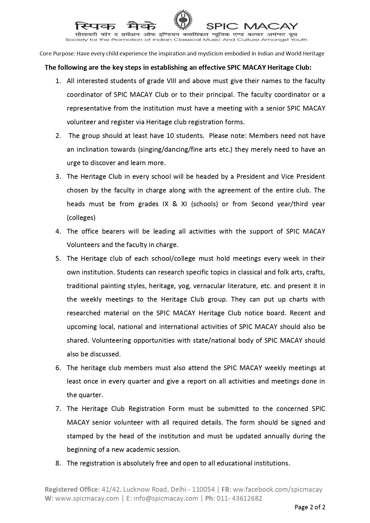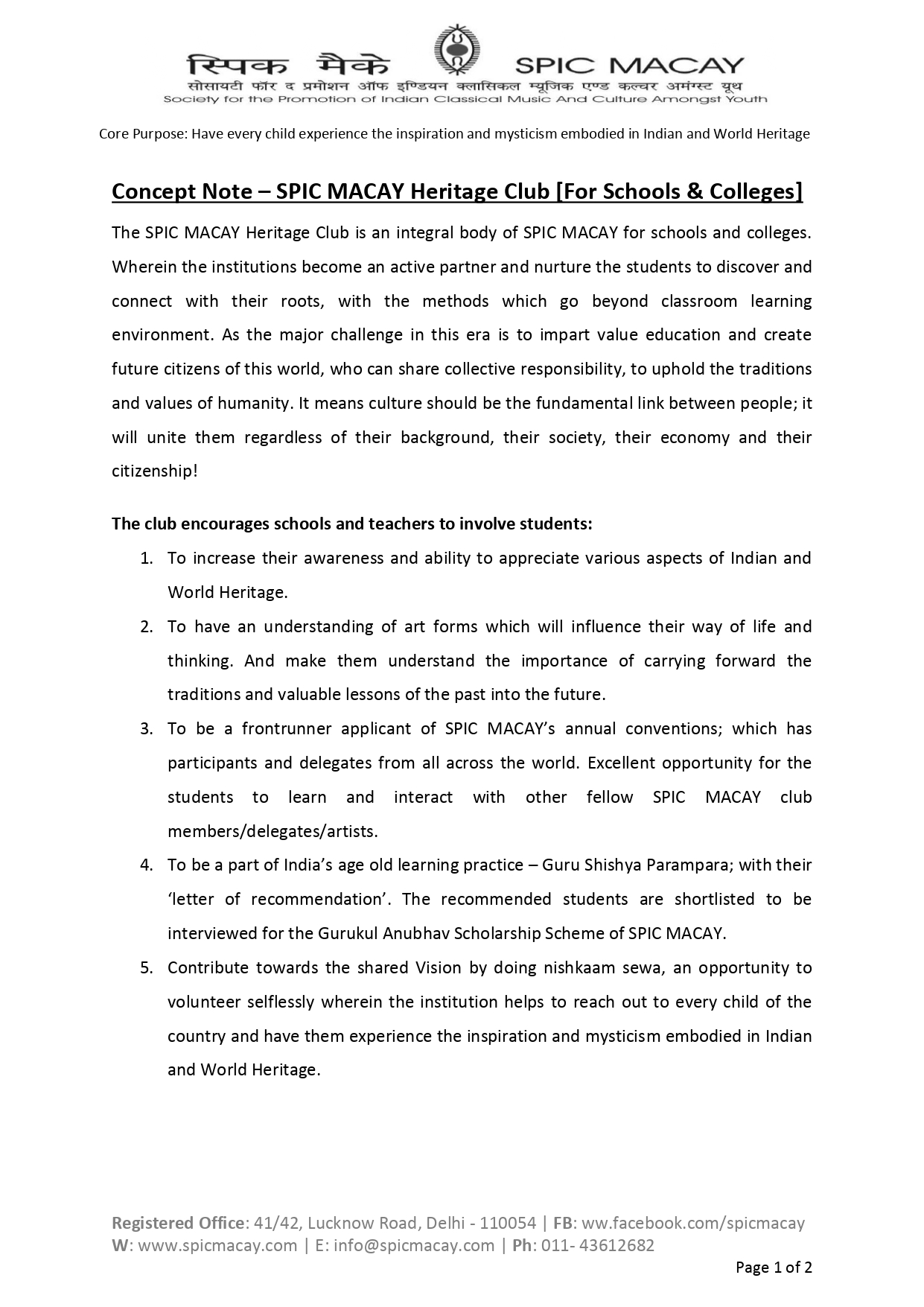 The SPIC MACAY Heritage Club is an integral body of SPIC MACAY for schools and colleges. Wherein the institutions become an active partner and nurture the students to discover and connect with their roots, with the methods which go beyond classroom learning environment. As the major challenge in this era is to impart value education and create future citizens of this world, who can share collective responsibility, to uphold the traditions and values of humanity. It means culture should be the fundamental link between people; it will unite them regardless of their background, their society, their economy and their citizenship!